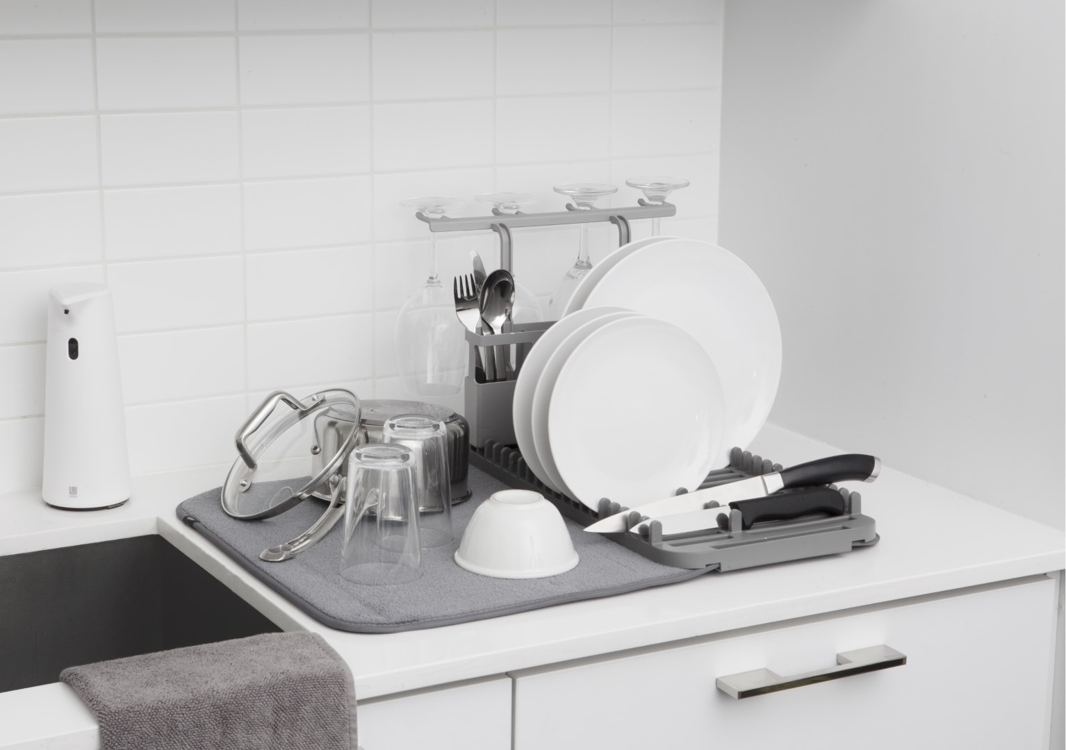 - Innowacyjne rozwiązanie do małych kuchni. Lekka i niezwykle chłonna suszarka do naczyń Udry marki Umbra to kompaktowy sposób na organizację naczyń i sztućców. Udry składa się z maty absorbującej wilgoć oraz stojaka na naczynia, sztućce i kuchenne akcesori