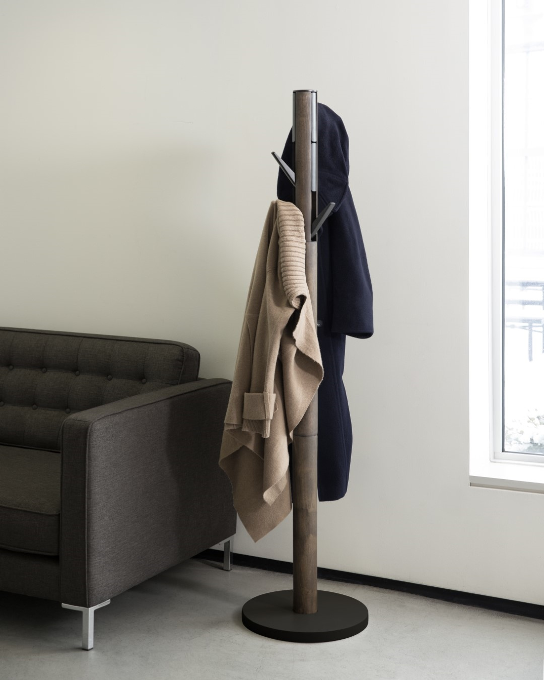 - UMBRA wieszak na ubrania FLAPPER w kolorze czarnego orzecha. To wysoki drewniany wieszak na ubrania, z dziewięcioma rozkładanymi haczykami, co zapewni dużo miejsca do przechowywania. Kiedy nie jest używany, haczyki można schować wewnątrz wieszaka. Posiada