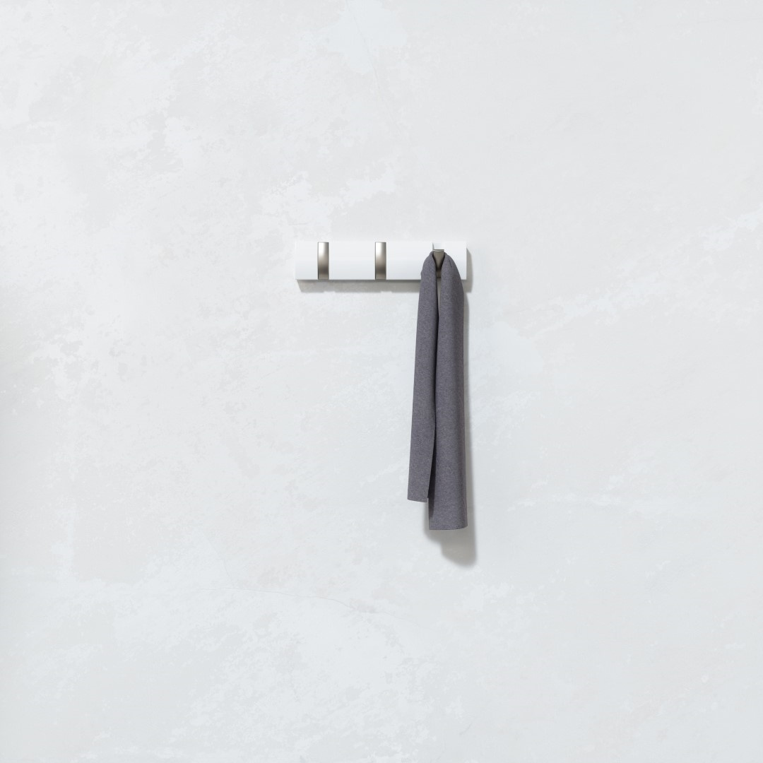 - UMBRA wieszak na ubrania FLIP 3 koloru białego. To nowoczesny, funkcjonalny, montowany na ścianie wieszak na ubrania z dużą ilością miejsca. Posiada trzy haczyki, które chowają się, gdy nie są używane, tym samym zapewniając elegancki wygląd. Jest to ideal