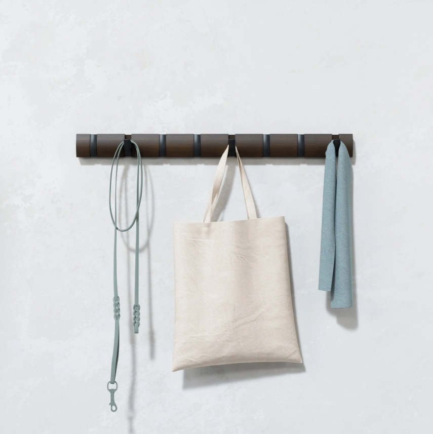 - UMBRA wieszak na ubrania FLIP 5 w kolorze czarne orzecha. To nowoczesny, funkcjonalny, montowany na ścianie wieszak na ubrania z dużą ilością miejsca. Posiada osiem haczyków, które chowają się, gdy nie są używane, tym samym zapewniając elegancki wygląd. J