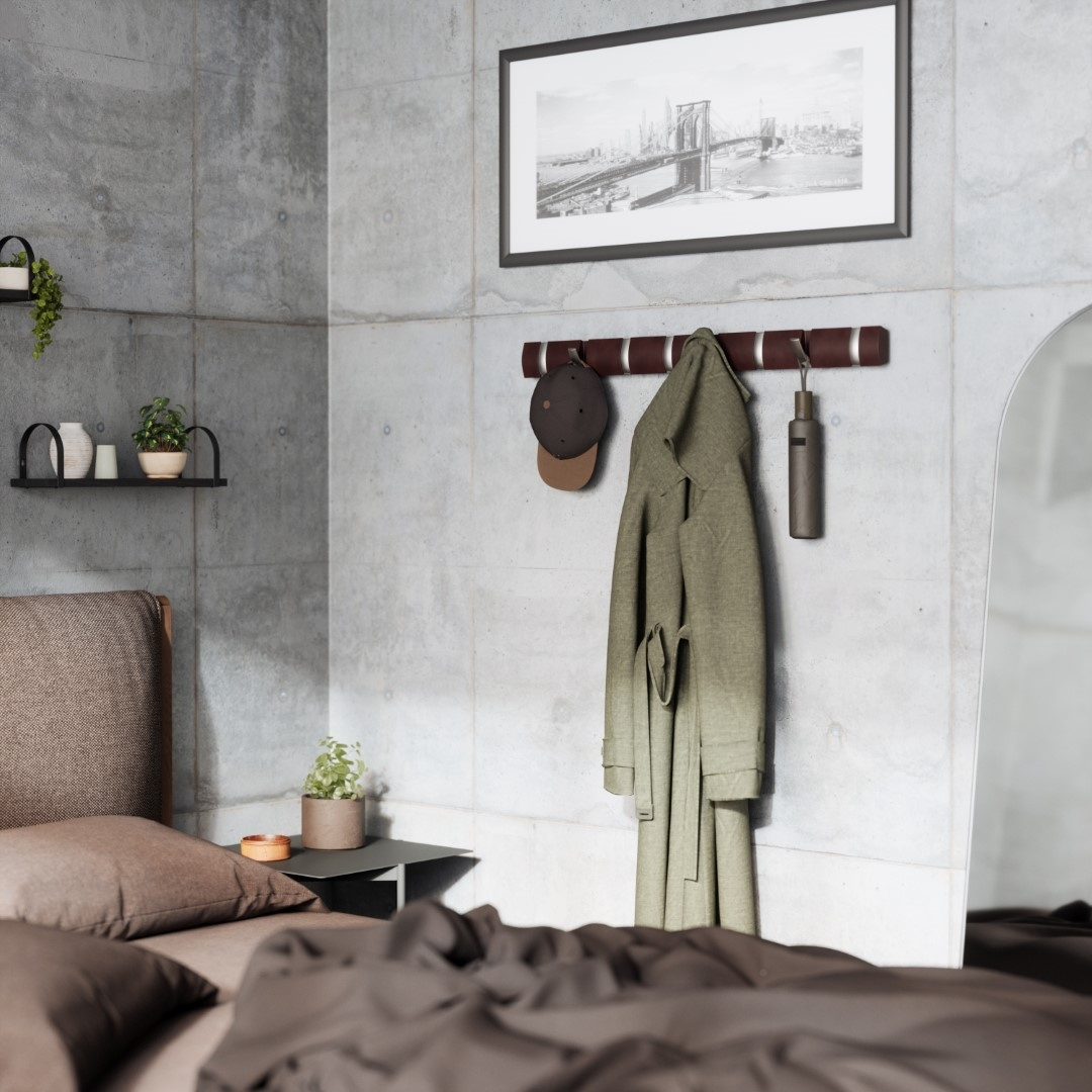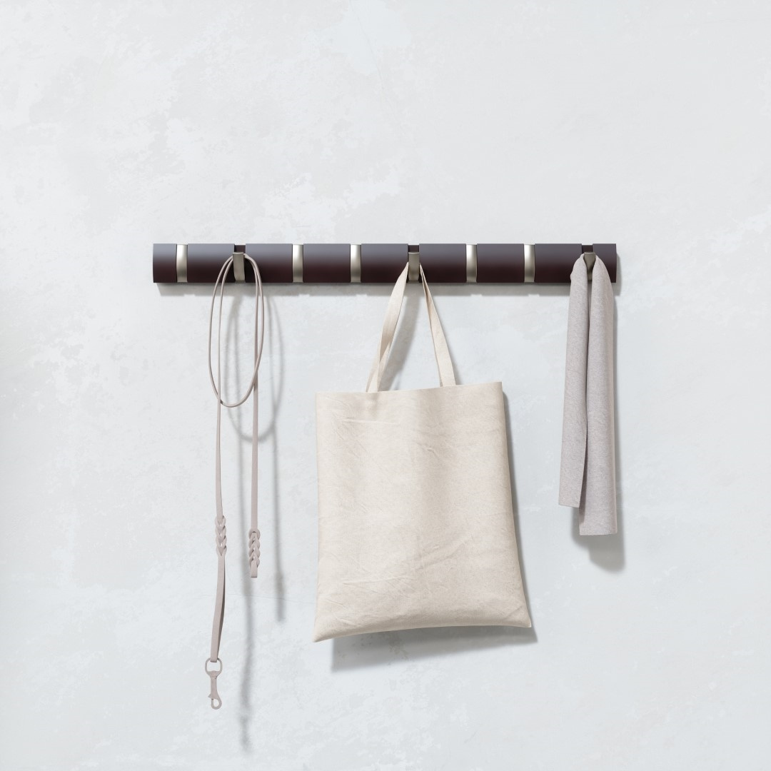 - UMBRA wieszak na ubrania FLIP 8 w kolorze espresso. To nowoczesny, funkcjonalny, montowany na ścianie wieszak na ubrania z dużą ilością miejsca. Posiada osiem haczyków, które chowają się, gdy nie są używane, tym samym zapewniając elegancki wygląd. Jest to