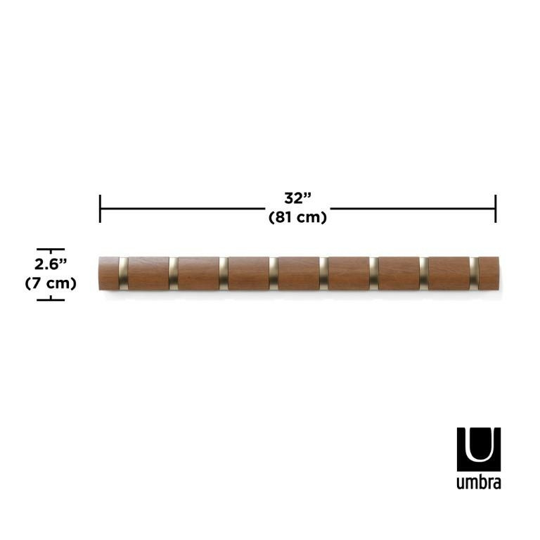 - UMBRA wieszak ścienny FLIP 8 koloru brązowego. Jest to nowoczesny, funkcjonalny, montowany na ścianie wieszak na ubrania z dużą ilością miejsca na powieszenie wybranych przez nas rzeczy. Jego ciekawa budowa charakteryzuje się tym, że haczyki w momencie ni