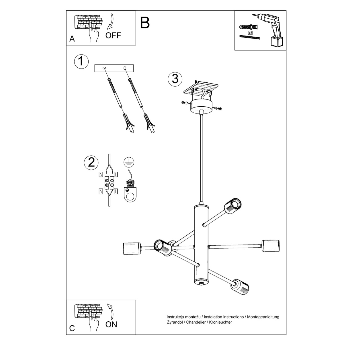 • Źródło światła: E27, 6x max 15W LED, ~230V, 50Hz, IP20, klasa ochronności IŹródło światła nie jest w komplecie.Wymiary: 60/60/85 cmMateriał: stal Kolor: czarny
