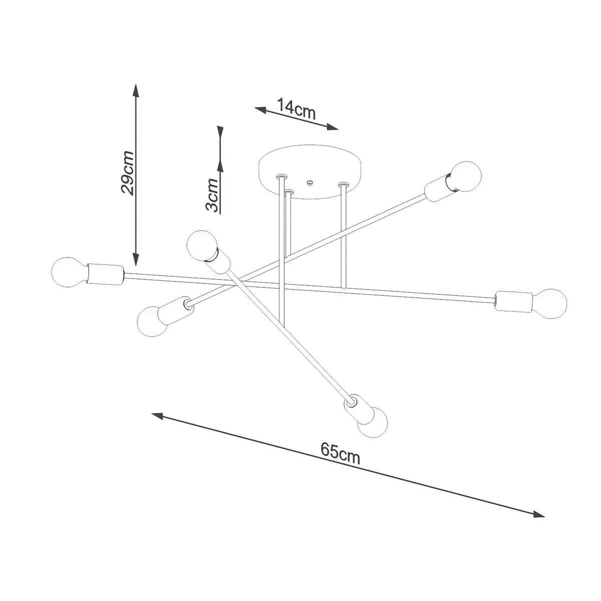 • Źródło światła: E27, 6x max 15W LED, ~230V, 50Hz, IP20, klasa ochronności IŹródło światła nie jest w kompelcie.Wymiary: 65/65/29 cmMateriał: stalKolor: czarny